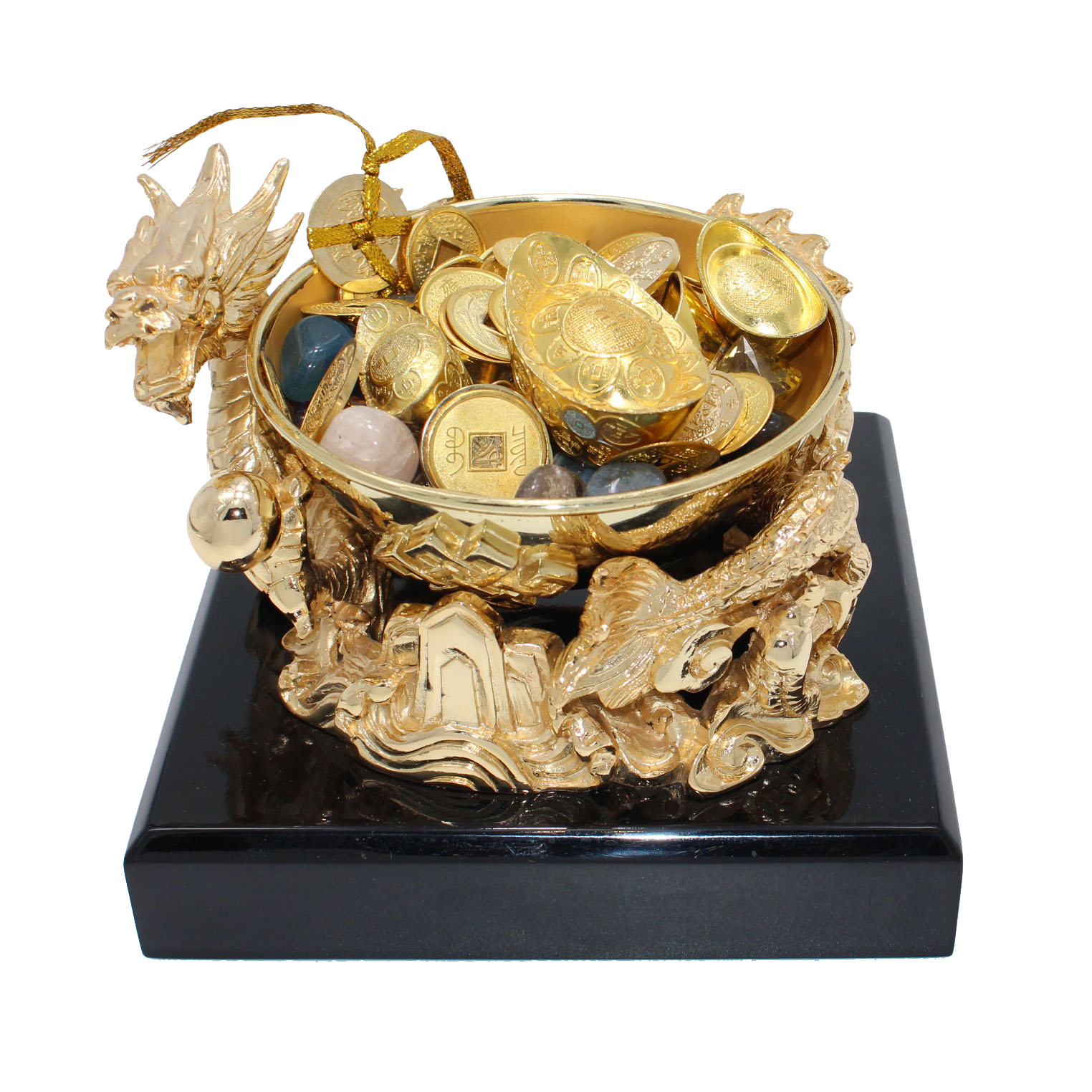 The Prosperity Wealth Bowl with the Dragon motif evokes the positive energies to ‘attract the auspices of wealth”.  The good fortune motif evokes the positive energies and filled up with Faux Diamonds, Gold Coins & Ingots to ‘attract the auspices of wealth. Display one in your office or within sight from the main entrance of your living room